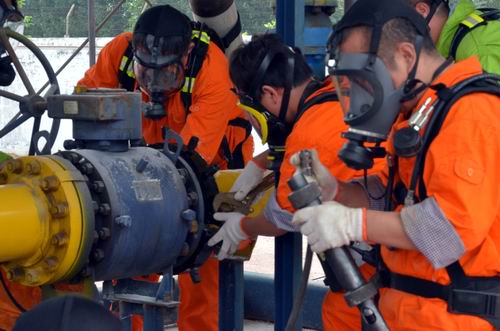 2013年6月20日上午9時,三門峽中裕靈寶末站發生一起高壓法蘭漏氣事故,靈寶末站值班人員迅速撥打了三門峽中裕應急搶險電話,30分鐘后,著裝整齊的三門峽公司各應急搶險組織人員緊急趕赴現場,本著“先控制事態發展,再降壓處置”的原則,到達人員首先拉警戒線、強制通風、聯系上游及用戶、管道降壓……一系列先期工作在搶險指揮部的統一調度下緊張有序地實施……