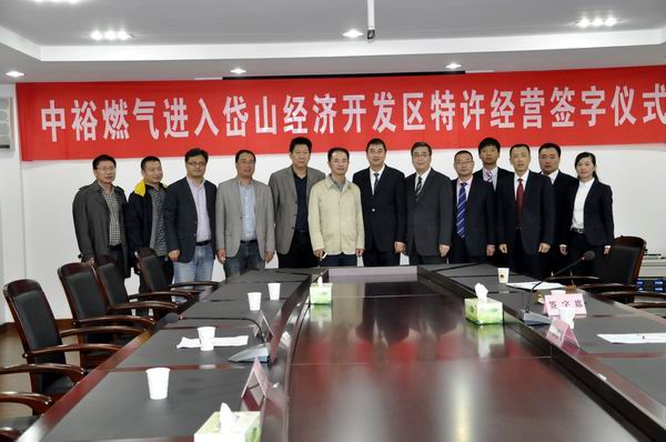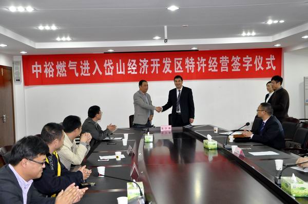 管理總部訊 為規范岱山城市管道燃氣特許經營活動,加強市場監管,保障社會公共利益和公共安全,11月20日,《浙江省岱山經濟開發區城市管道燃氣特許經營協議》簽約儀式順利舉行, 集團副總裁彭軍先生與岱山縣住建局總工程師葉海平先生代表雙方在協議書上簽字。岱山縣住建局局長孔德科、岱山縣發改局副局長馬海軍、岱山經濟開發區管委會副主任王朝錚、岱西鎮鎮長傅建波等縣、鎮政府領導及管理總部投資規劃部總經理白旭光、浙江中裕燃氣有限公司總經理王平良等管理人員共聚岱山,見證了簽約儀式。